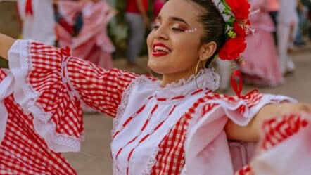 La cumbia no solo es música, sino también una danza cargada de simbolismo. Tradicionalmente, representa un juego de cortejo en el que la mujer, sosteniendo una vela, ejecuta movimientos elegantes y circulares, mientras el hombre la rodea con pasos cortos y respetuosos. Este diálogo coreográfico refleja tanto la herencia africana como las normas sociales impuestas durante la colonia, convirtiéndose en un símbolo de identidad y resistencia cultural.